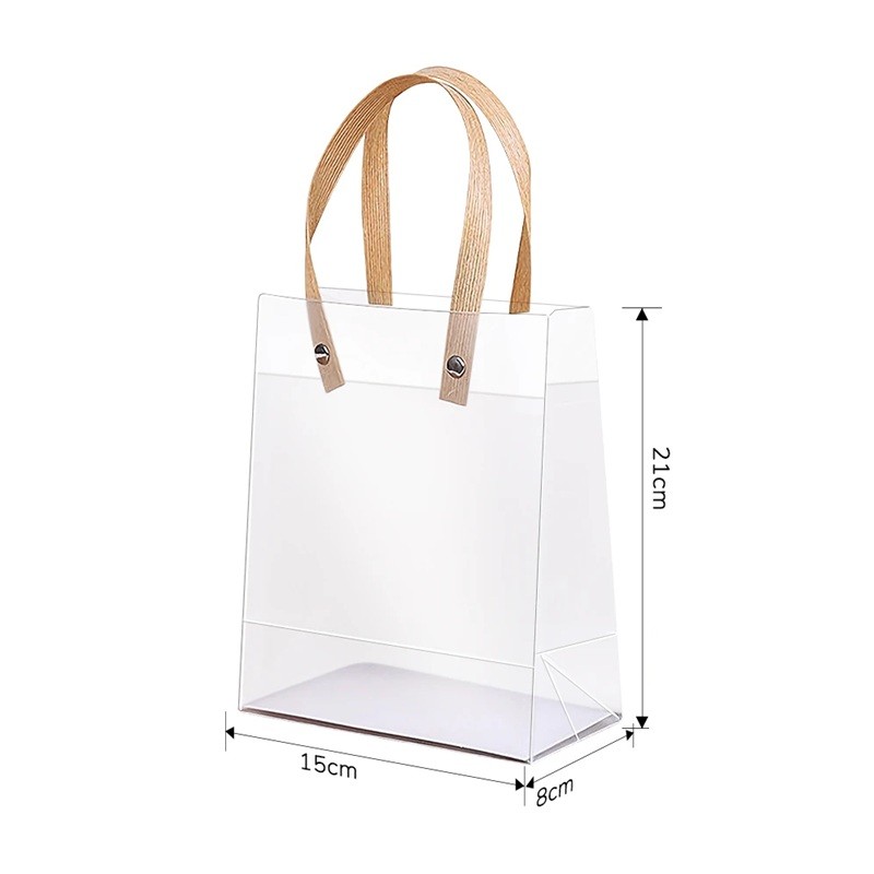 Το υλικό PVC είναι αδιάβροχο, πλενόμενο και ανθεκτικό σε ζημιές, εξασφαλίζοντας μεγάλη διάρκεια ζωής και κατά την επαναλαμβανόμενη χρήση. Ο μινιμαλιστικός διαφανής σχεδιασμός μπορεί εύκολα να συνδυαστεί με διάφορες διακοσμήσεις, κορδέλες ή ετικέτες. Χάρη στην καθολική του εμφάνιση, αυτές οι τσάντες είναι κατάλληλες για προσωπική και εμπορική χρήση – ιδανικές για παράδειγμα κατά την συσκευασία προϊόντων σε μπουτίκ, καλλυντικά σαλόνια ή σε γαμήλιες μπομπονιέρες.