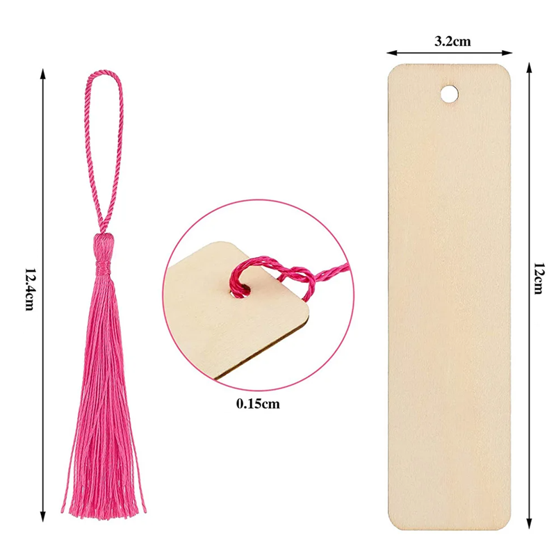 - Περιεχόμενα συσκευασίας: 10 τμχ ξύλινων σελιδοδεικτών, 10 τμχ πολύχρωμες φούντες, 10 τμχ σχοινάκια.