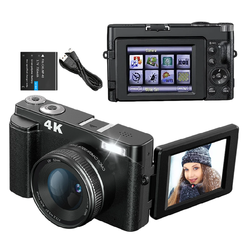 4K ψηφιακή κάμερα με περιστρεφόμενη οθόνη 3" και φλας 48MP Webcam HDMI micro USB Καλώδιο Καπάκι Φακού Τσάντα Ζώνη