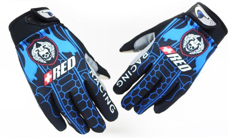 Αυτά τα γάντια με εκτύπωση κρανίου και την επιγραφή Racing είναι κατάλληλα για αθλητισμό.