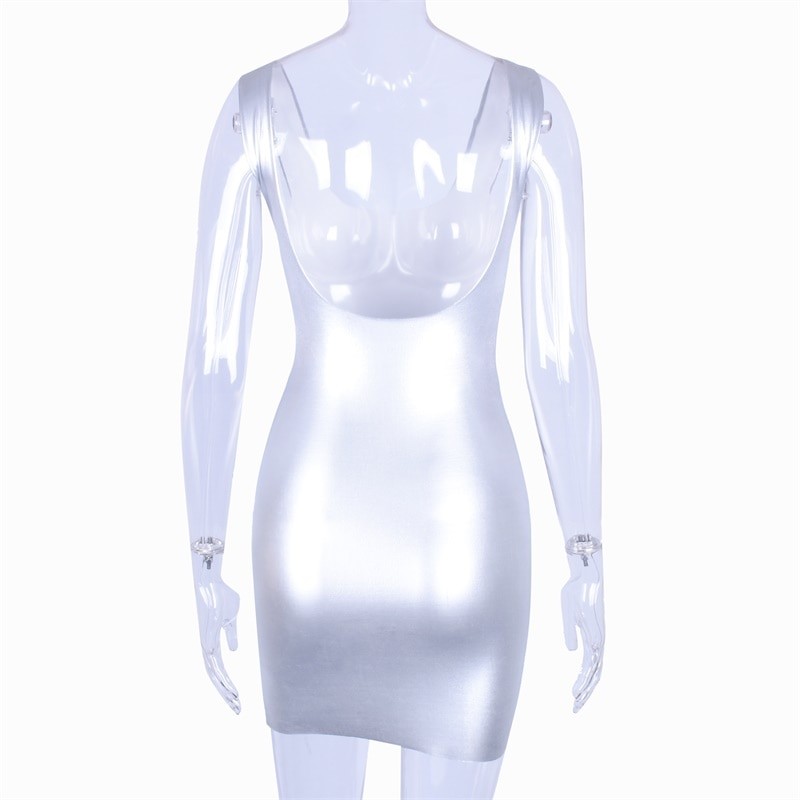 Σέξι φορέματα πάρτι με τιράντες από λαμπερό ελαστικό υλικό.