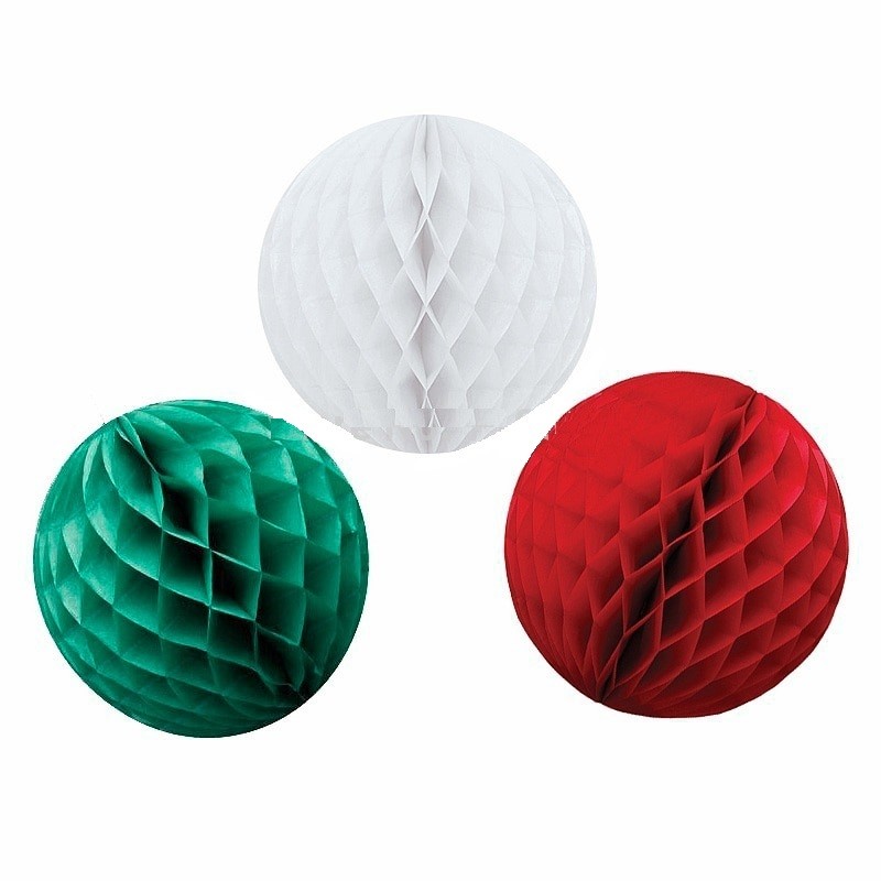 Συλλογή χάρτινων διακοσμητικών μπαλών διαφόρων μεγεθών σε χριστουγεννιάτικα χρώματα (κόκκινο, πράσινο, λευκό).