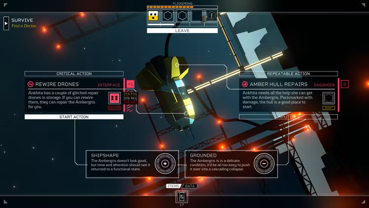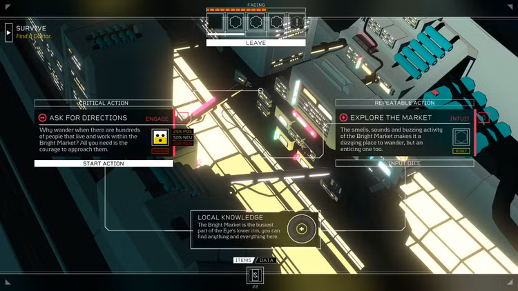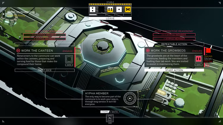 Κάθε κύκλο ρίχνετε ζάρια. Αντιστοιχίστε τους σε μια ευρεία γκάμα δράσεων που είναι διαθέσιμες στον σταθμό. Σε κάθε δράση επιλέξτε σε τι και σε ποιον νοιάζεστε, σχηματίζοντας τις ζωές των ανθρώπων γύρω σας και τελικά το μέλλον του σταθμού.