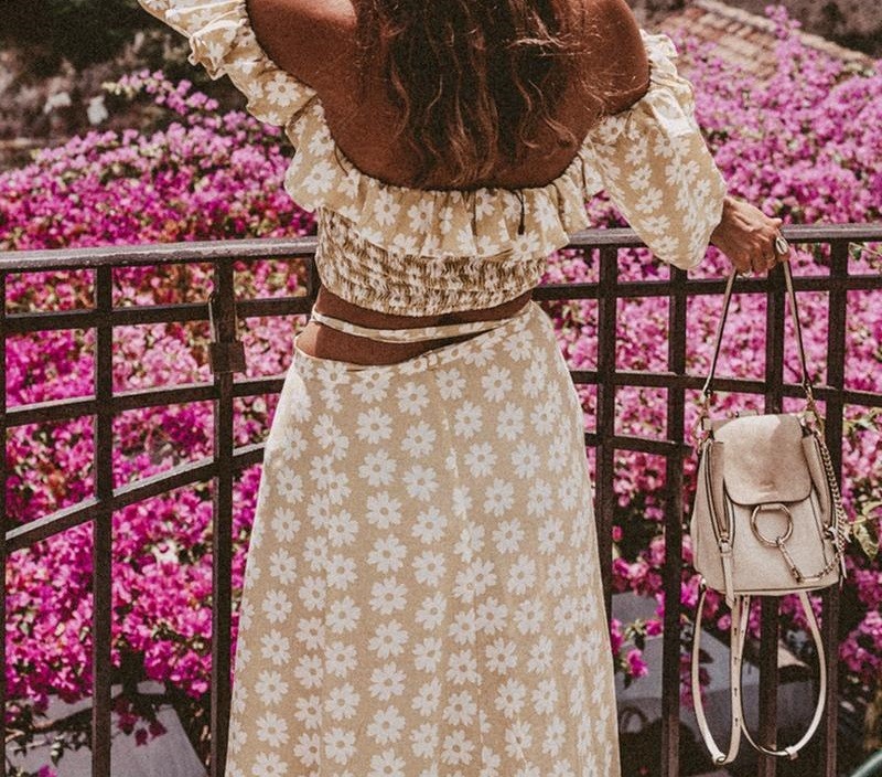 Top με εκτεθειμένους ώμους και φούστα τύπου περιτύλιγμα σε μήκος midi.