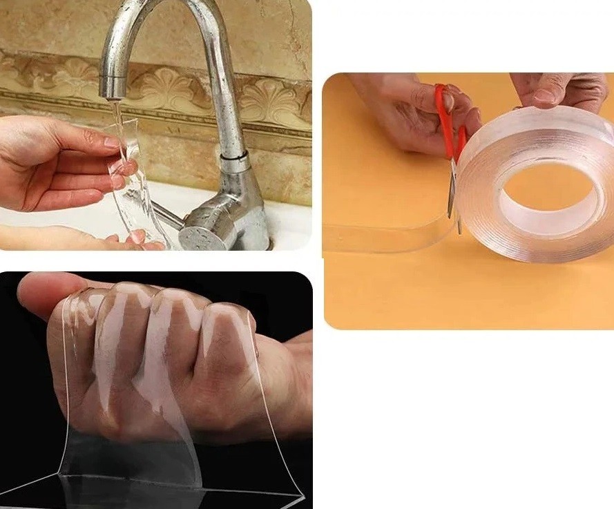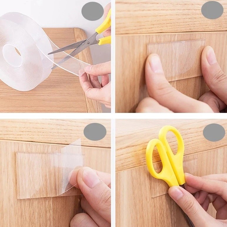 Η διπλής όψης διαφανής κολλητική ταινία είναι ο ιδανικός βοηθός, αν θέλετε να κολλήσετε κάτι εύκολα, αλλά σταθερά χωρίς τρύπημαΕφαρμόσιμη σε οποιαδήποτε επιφάνεια - τοίχο, γυαλί, ξύλο κ.λπ. Είναι πλενόμενη και μπορεί να ξαναχρησιμοποιηθεί έως 600 φορές. Η κολλητική ταινία είναι επίσης αδιάβροχη. Έχει πλάτος 30 mm.