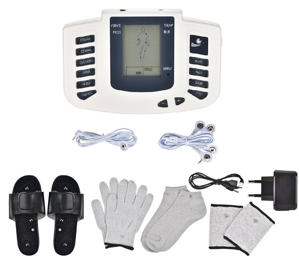 Περιεχόμενα συσκευασίας: 1x ηλεκτροδιεγερτής, 16x ηλεκτρονική επιφάνεια, 1x ηλεκτρονικό καλώδιο, 1x EU προσαρμογέας, 1x καλώδιο φόρτισης, 2x παντόφλες, 2x γάντια, 2x κάλτσες, 2x καλύμματα καρπού