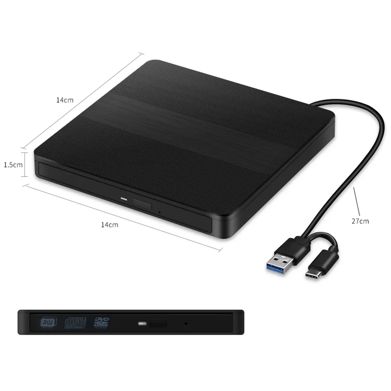 Εξωτερική μονάδα CD/DVD 14 x 14 x 1,5 εκ. USB 3.0 και USB-C Plug and Play Φορητή οπτική μονάδα για Windows Linux Mac OS ABS
