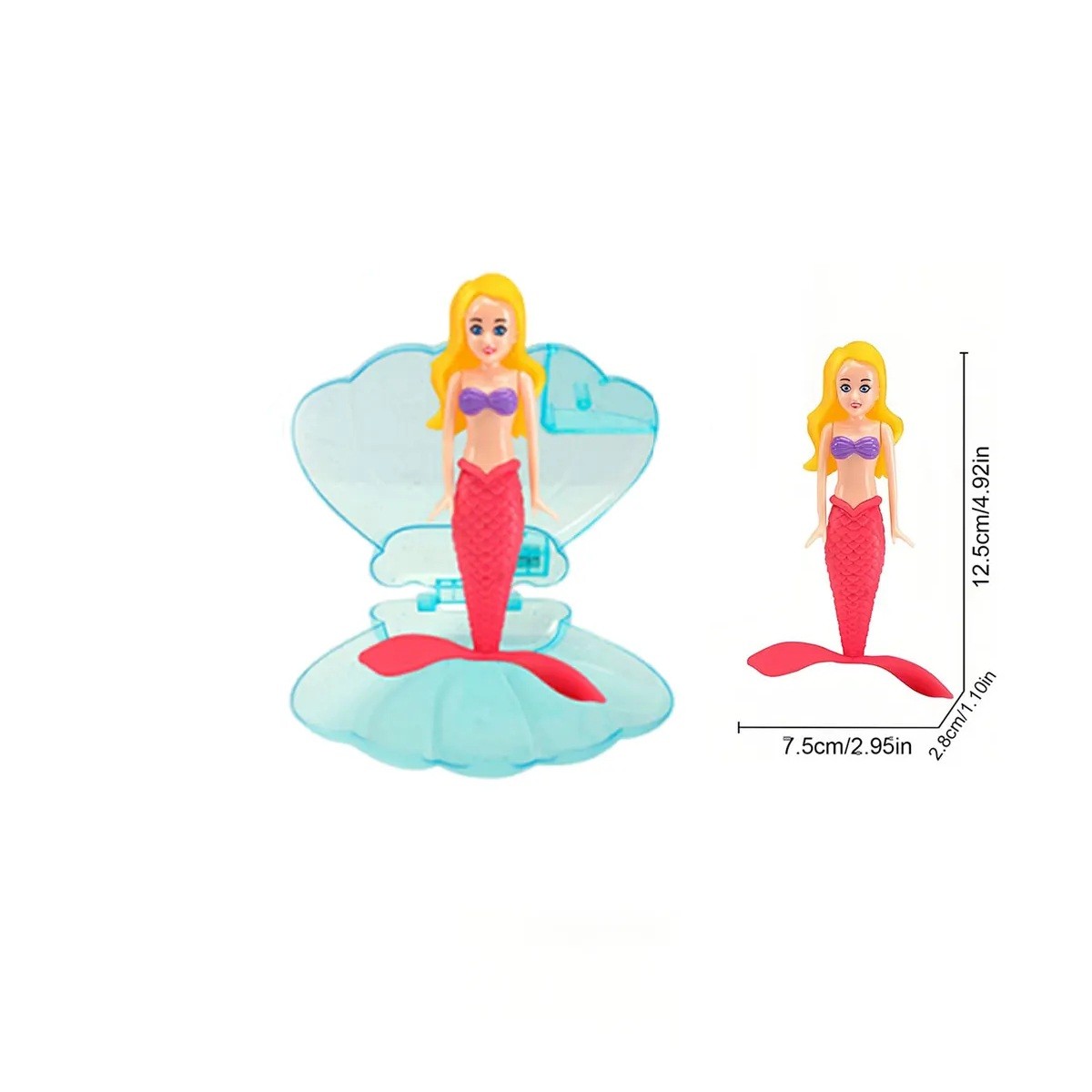 Αυτή η γοργόνα σε κοχύλι προσφέρει στα παιδιά μια πρωτότυπη θαλάσσια διασκέδαση βασισμένη σε έναν απλό, αλλά πολύ εντυπωσιακό μηχανισμό αυτόματης ανοίγματος. Η κούκλα έχει διαστάσεις 12,5 × 7,5 × 2,8 εκ. και έχει σχεδιαστεί ώστε να επιπλέει καλά και να εντυπωσιάζει με την απαλή κίνησή της κατά την ανάδυση. Το κοχύλι είναι διαθέσιμο σε δύο παραλλαγές – διαφανές μπλε και διαφανές ροζ, με το χρώμα του κοχυλιού να καθορίζεται σταθερά κατά την επιλογή του πελάτη. Η ίδια η κούκλα αποστέλλεται τυχαία ανάλογα με την τρέχουσα παραγωγική έκδοση, προσθέτοντας ένα στοιχείο έκπληξης στο παιχνίδι.