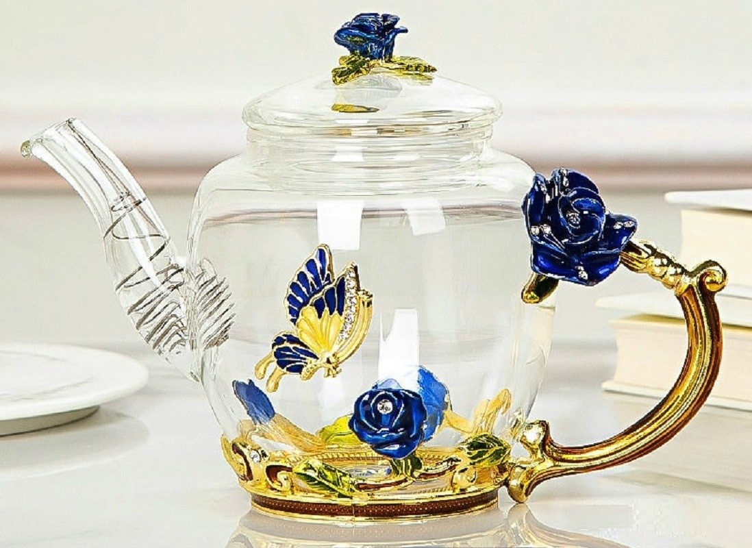 Διακοσμημένη τσαγιέρα με προεξέχοντα διακοσμητικά στοιχεία ρόζας.