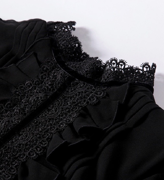 Γιακάς και μανίκια διακοσμημένα με δαντέλα.