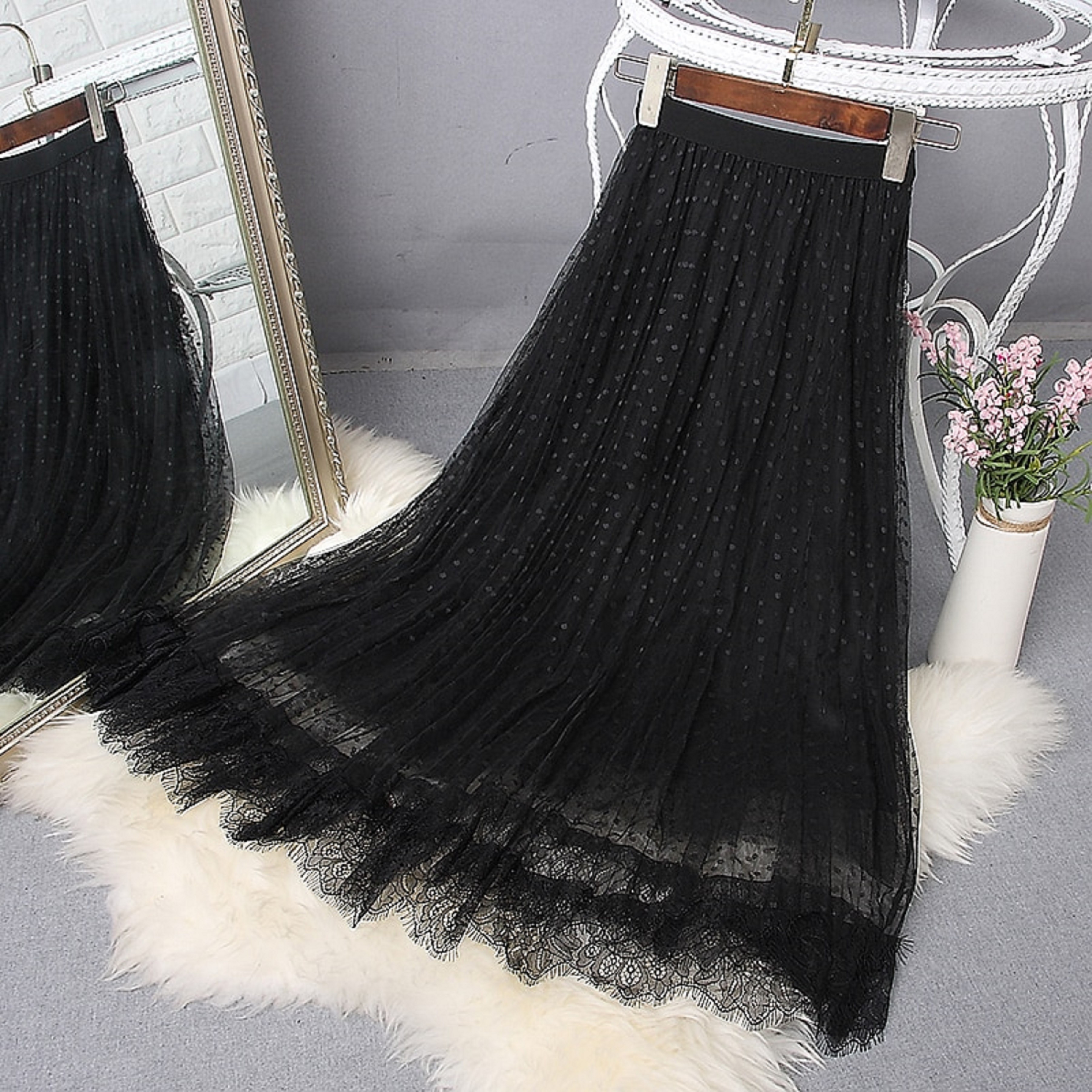 Γυναικεία μακριά φούστα με δαντέλα και πουά