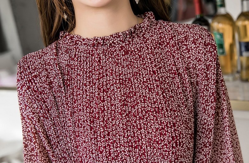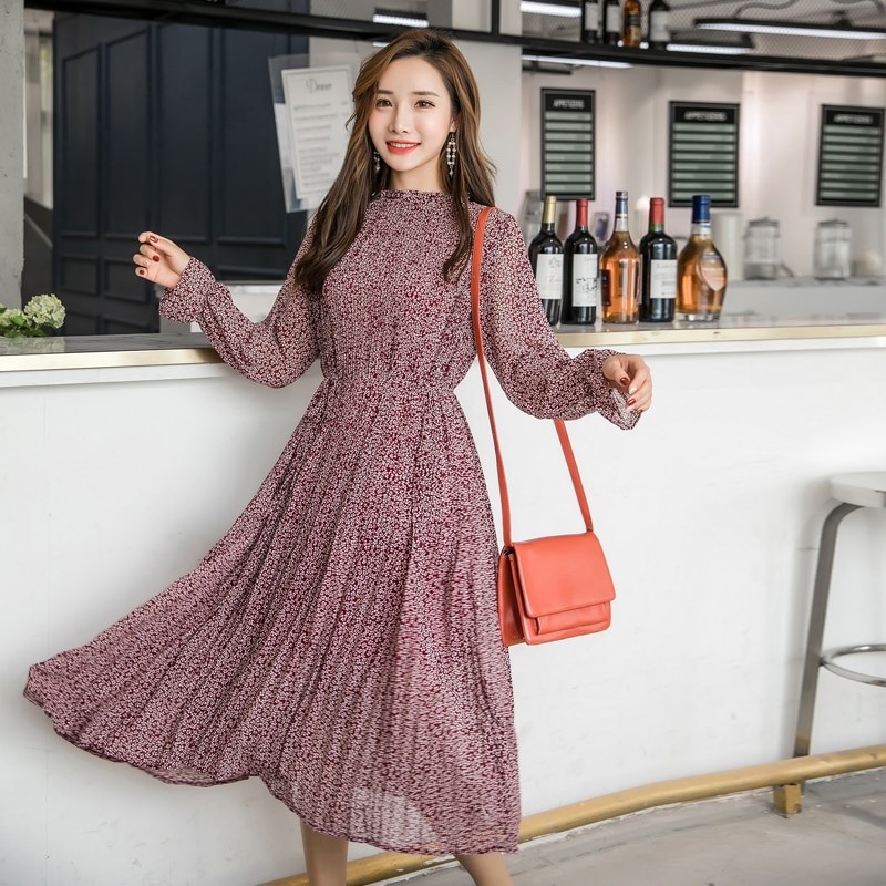 Λεπτή εκτύπωση, πλισέ φούστα και μακριά μανίκια.