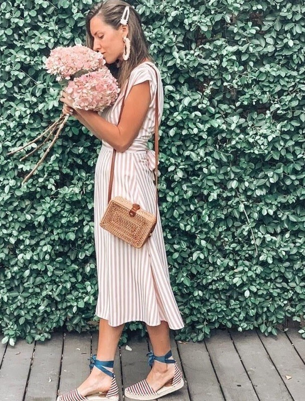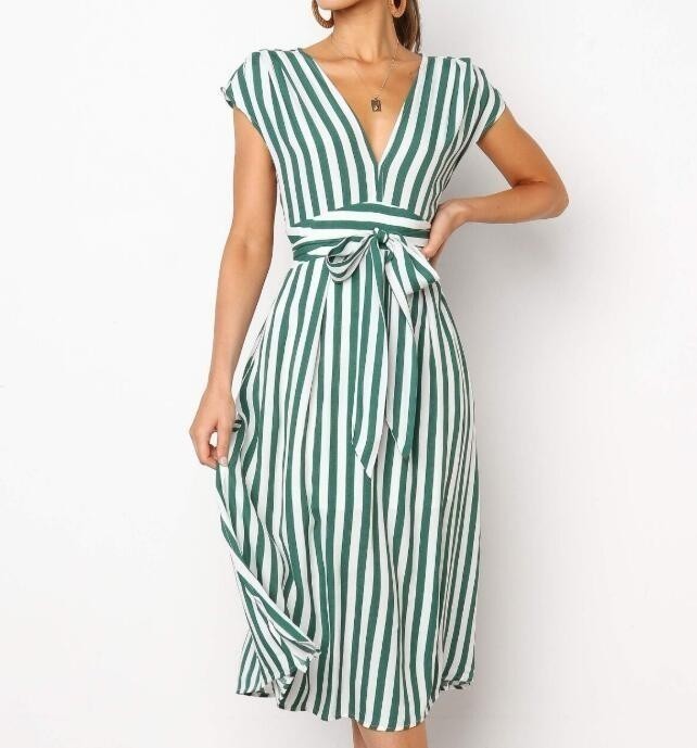Πάντα κομψές ρίγες! Απλό φόρεμα με V ντεκολτέ και φιόγκο.