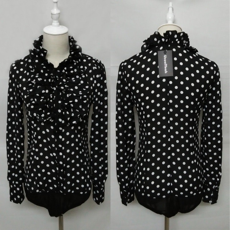 Έχει μακριά μανίκια και λαιμόκοψη με βολάν.