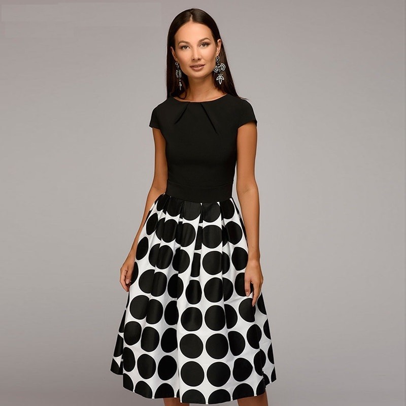 Κομψό φόρεμα με λαιμόκοψη σε σχήμα Ο και κοντό μανίκι.