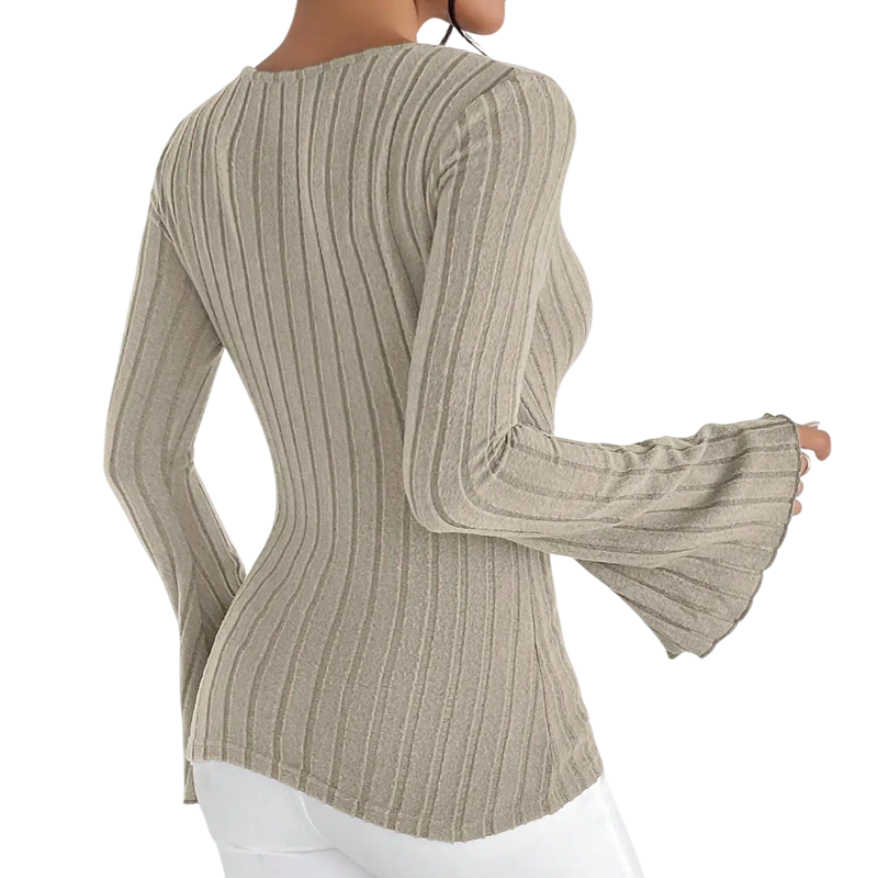 Κομψό εφαρμοστό τοπ με έντονο V ντεκολτέ και μανίκια καμπάνας που αναδεικνύει τη σιλουέτα και προσφέρει στυλάτη εμφάνιση για καθημερινή και κοινωνική χρήση. Πλήρης περιγραφή