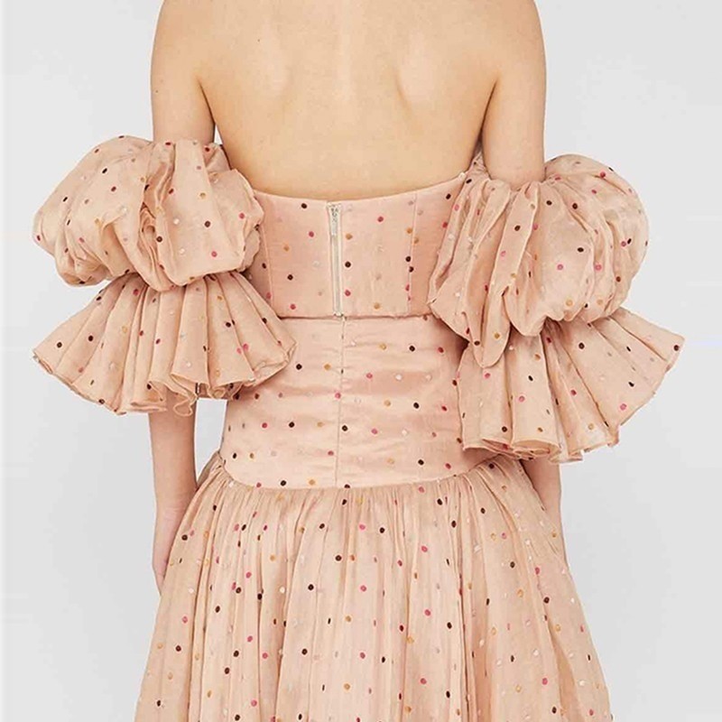 Έχει εκτεθειμένους τους ώμους και τα φουσκωτά μανίκια ξεκινούν από τους αγκώνες.