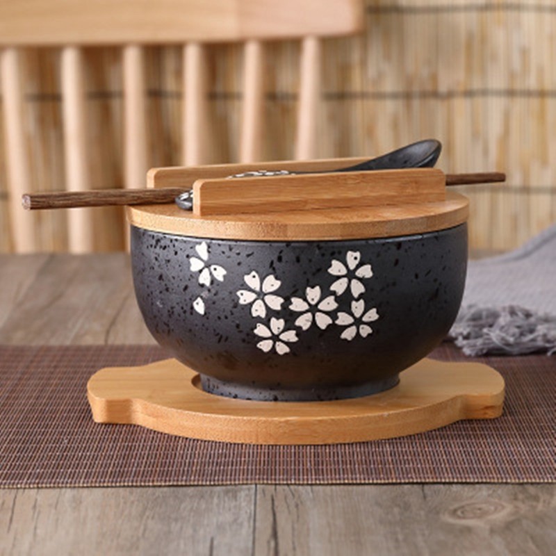 Παραδοσιακό ιαπωνικό μπολ με ξύλινο καπάκι, ραβδιά και κουτάλι.