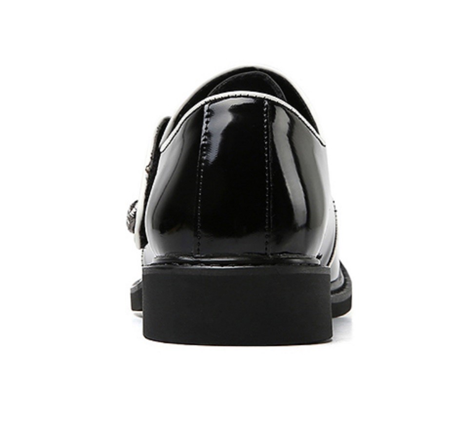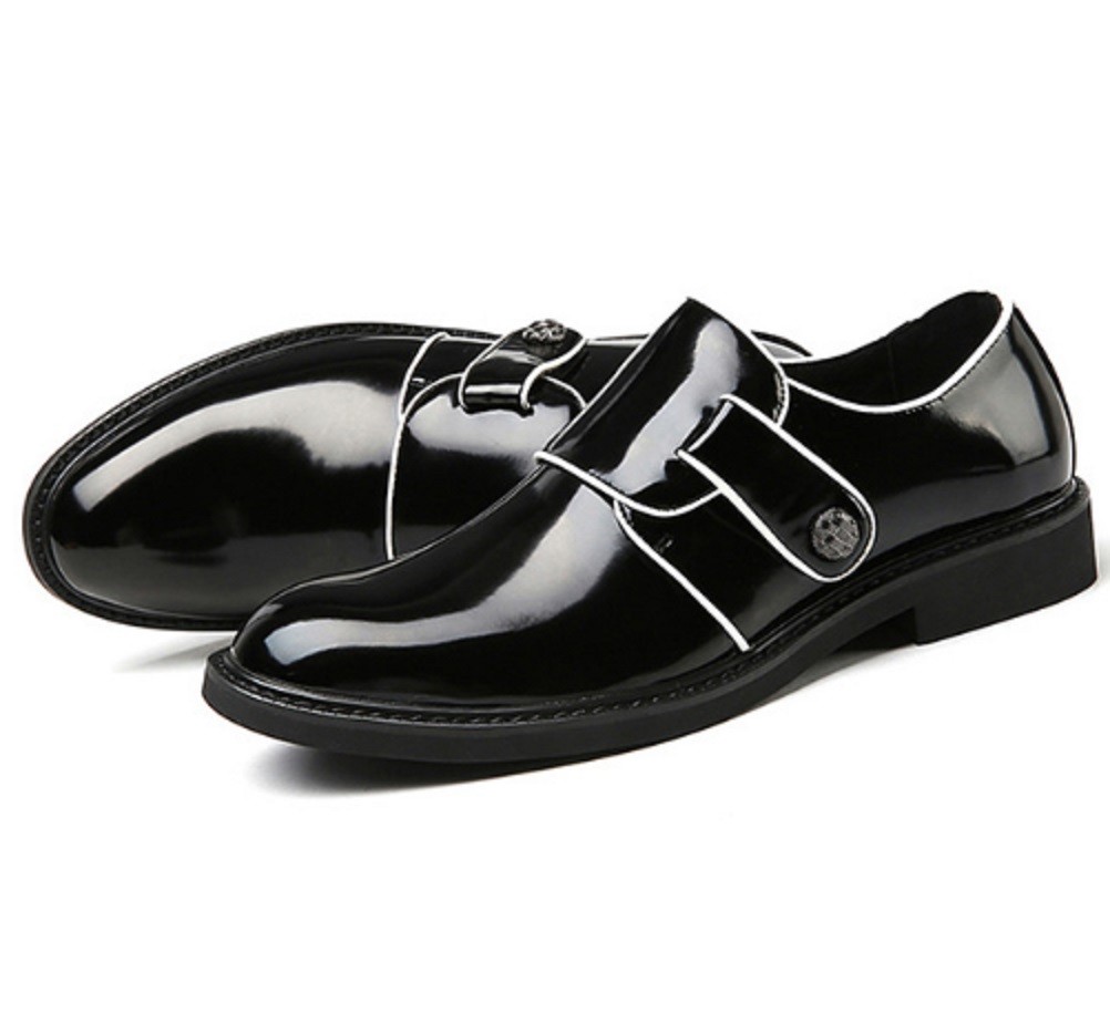 Ανδρικά μαύρα λουστρίνια παπούτσια με λευκή περιφέρεια που ταιριάζουν σε επίσημες εμφανίσεις.