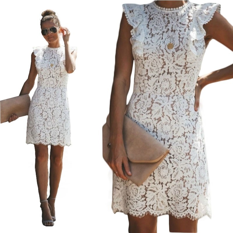 Κομψά γυναικεία δαντελένια φορέματα πάνω από το γόνατο με φουσκωτά μανίκια.