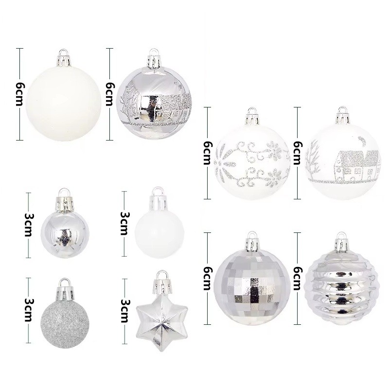 Ο συνδυασμός σχημάτων μπαλών και αστεριών σε διάφορα μεγέθη θα διασφαλίσει ότι η διακόσμηση θα φαίνεται δυναμική και φυσική. Η διάμετρος των επιμέρους διακοσμητικών κυμαίνεται μεταξύ 3 έως 6 εκ, γεγονός που διευκολύνει την τοποθέτησή τους στο χώρο. Ο συνδυασμός ασημί-λευκού χρώματος συμβολίζει την καθαρότητα, την χειμερινή ηρεμία και την κομψότητα. Οι διακοσμήσεις λάμπουν όμορφα στο φυσικό φως της ημέρας αλλά και στον βραδινό φωτισμό. Η ποικιλία μεγεθών των διακοσμητικών επιτρέπει ομοιόμορφο στολισμό του δέντρου χωρίς την ανάγκη επιπλέον συνδυασμού. Οι διακοσμήσεις είναι κατασκευασμένες από ελαφρύ πλαστικό υλικό, επομένως κρεμιούνται εύκολα και η χειρισμός τους είναι πολύ άνετος.