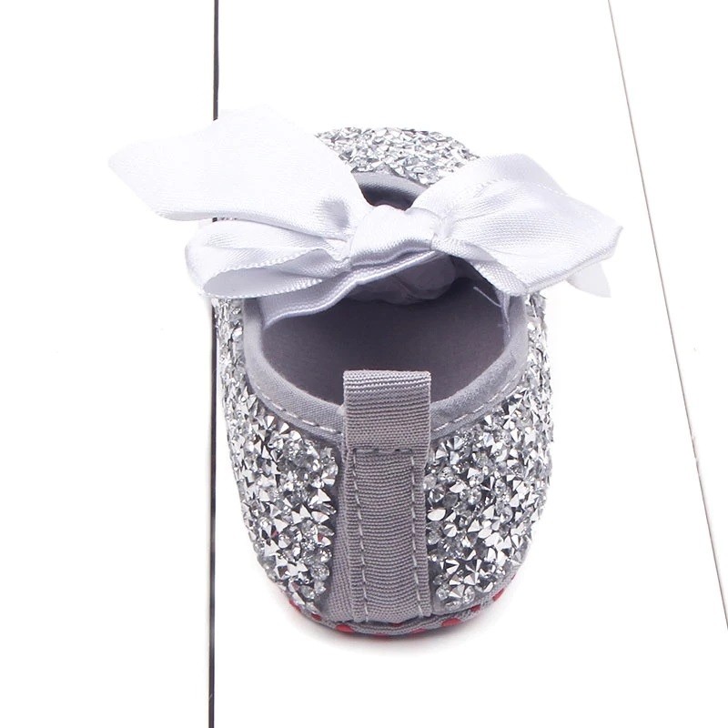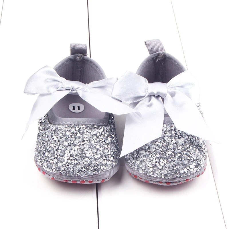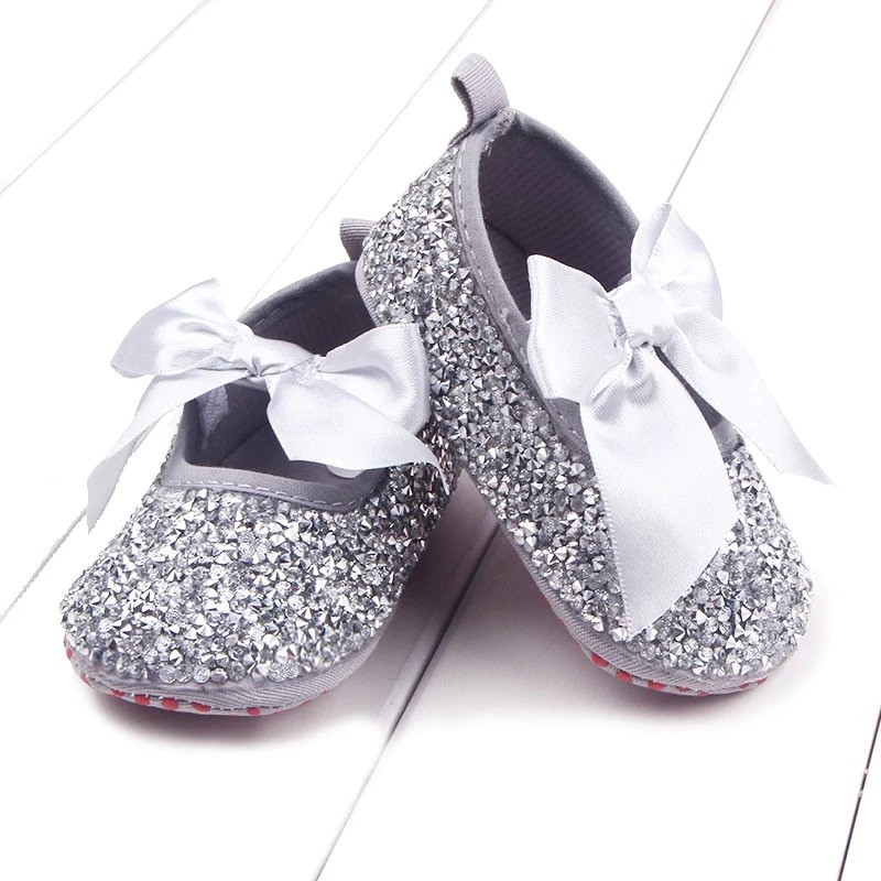 Κοριτσίστικα ασημένια παπουτσάκια είναι κατάλληλα για μικρές πριγκίπισσες μέχρι 1 έτους.