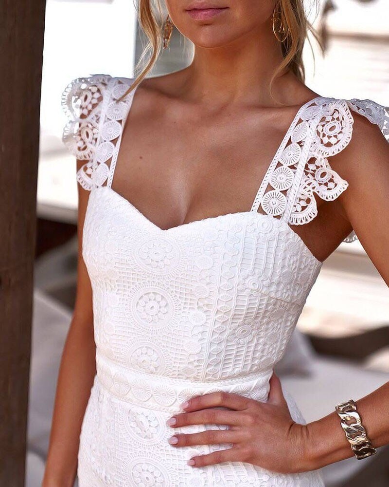 Όμορφα δαντελένια φορέματα με τιράντες σε λαμπερό λευκό χρώμα.