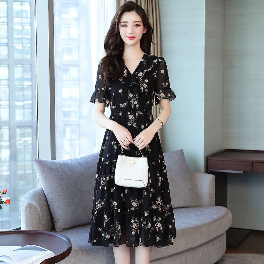 Ρομαντικά μαύρα φορέματα με βολάν και λουλουδάτο σχέδιο.