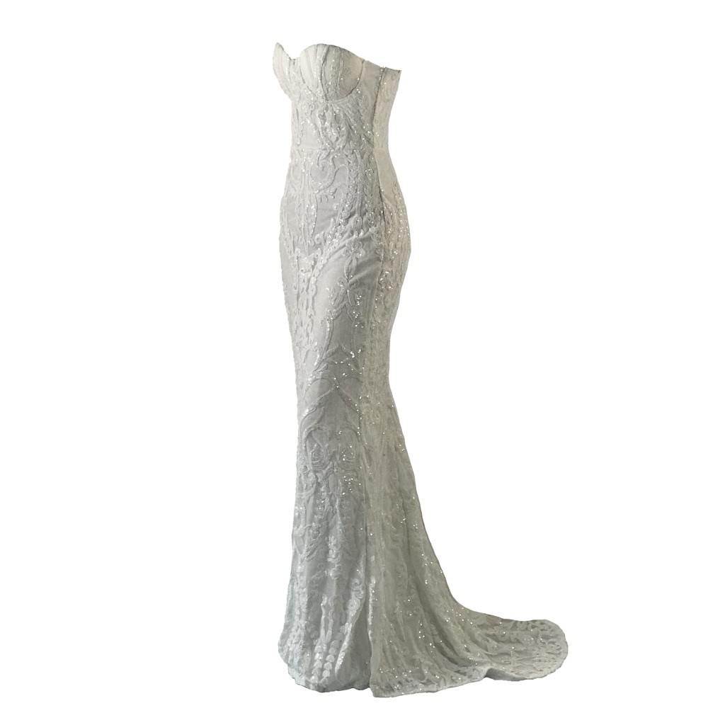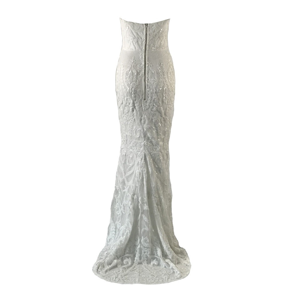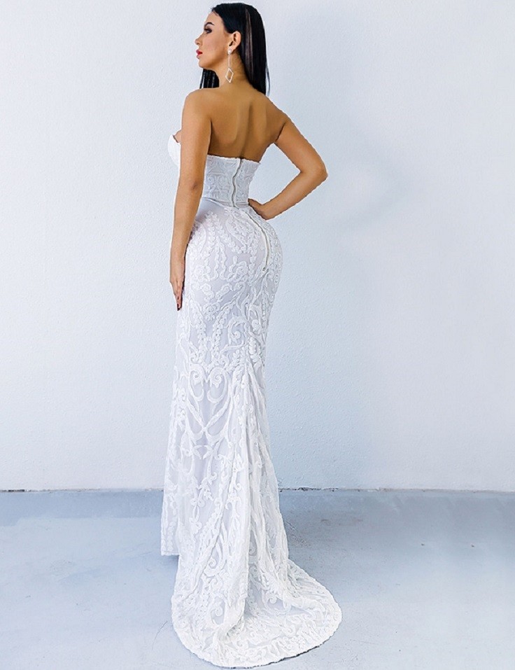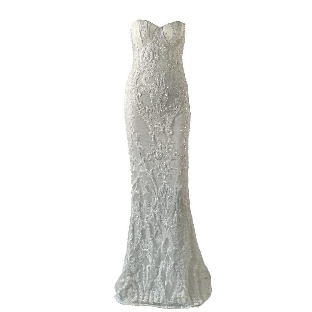 Λαμπερά μακριά δαντελένια φορέματα χωρίς τιράντες.