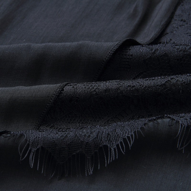 Πολυτελή μαύρα φορέματα κάτω από το γόνατο με ασύμμετρη φούστα διακοσμημένη με δαντέλα.
