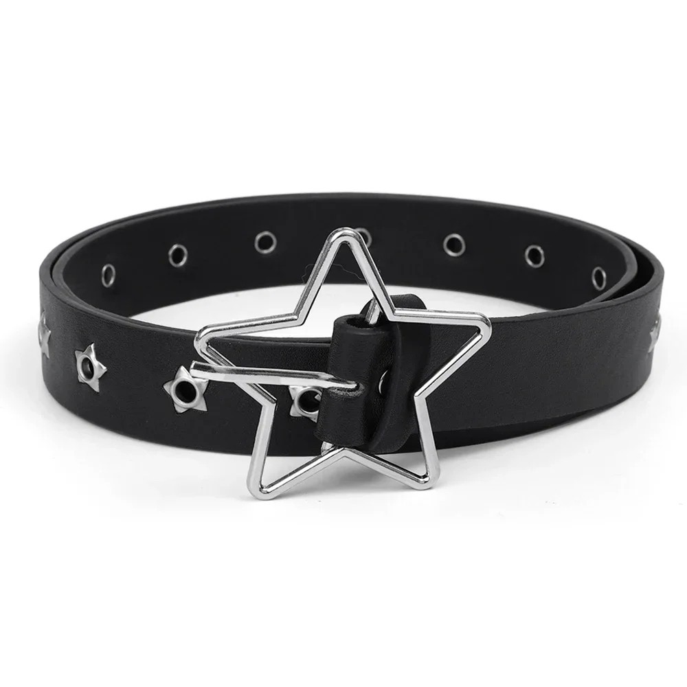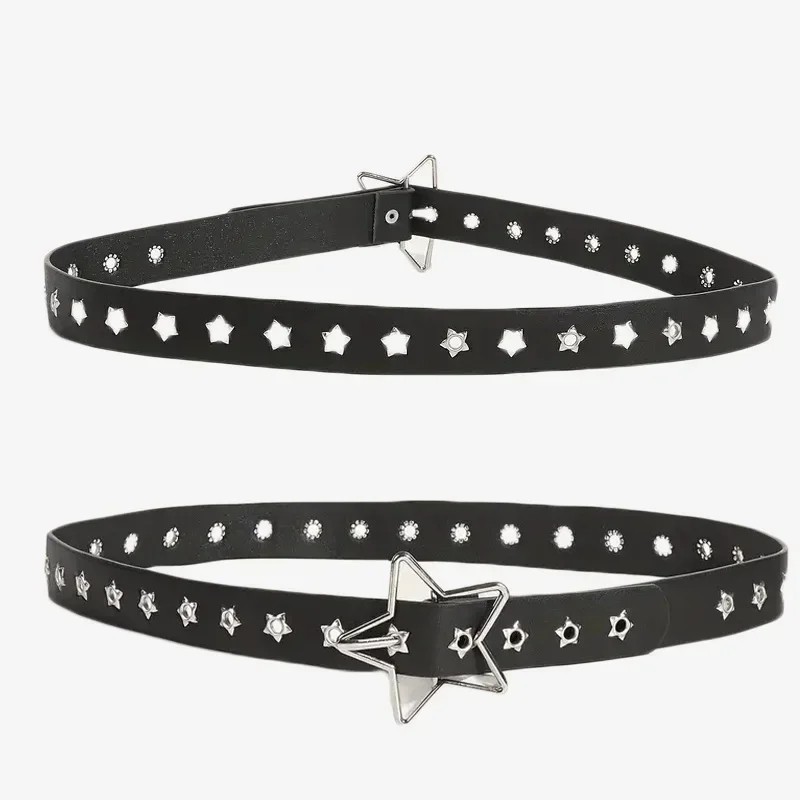 Στυλάτη μαύρη ζώνη με λεπτομέρειες από καρφιά και αγκράφα σε σχήμα αστεριού, ιδανική για ροκ εμφάνιση ή εντυπωσιακό αξεσουάρ καθημερινής μόδας. Πλήρης περιγραφή