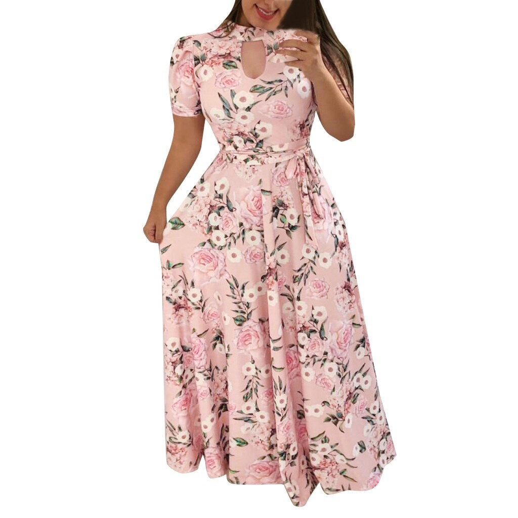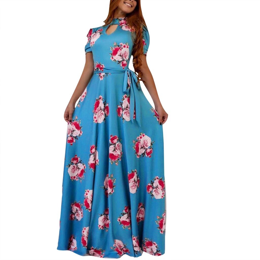Γυναικείο μακρύ μάξι φόρεμα με λαιμόκοψη και κοντό μανίκι.
