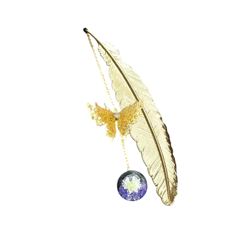 Ο μεταλλικός σελιδοδείκτης με φτερό και πεταλούδα σε αλυσίδα είναι ένα διακοσμητικό αξεσουάρ ανάγνωσης που συνδυάζει πρακτική λειτουργία με λεπτό διακοσμητικό σχεδιασμό. Η κύρια μέρος αποτελείται από ένα λεπτομερώς επεξεργασμένο μεταλλικό φτερό, το οποίο τοποθετείται μεταξύ των σελίδων του βιβλίου και βοηθά στην ακριβή σήμανση του σημείου που διαβάζεται. Στο φτερό ακολουθεί μια αλυσίδα που καταλήγει σε πεταλούδα και γυάλινη μπίλια, οι οποίες παραμένουν ορατές πάνω από την άκρη του βιβλίου και διευκολύνουν την αφαίρεση του σελιδοδείκτη. Το σύνολο φαίνεται κομψό και ταιριάζει τόσο σε βιβλία όσο και σε ημερολόγια ή σημειωματάρια.