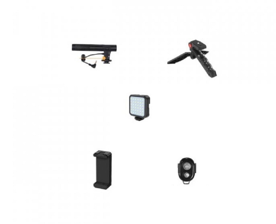 Περιεχόμενα συσκευασίας: 1x μικρόφωνο, 1x βάση, 1x LED φως, 1x στήριγμα για τηλέφωνο, 1x σκανδάλη