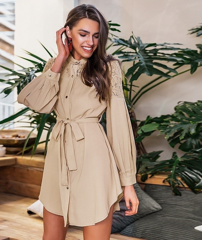 Χαλαρό κοντό φόρεμα σε στυλ πουκαμίσα διακοσμημένο με λεπτή δαντέλα.