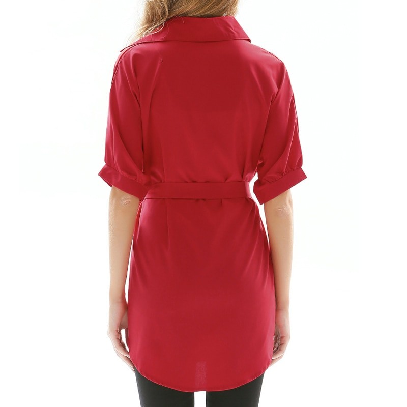 Χαλαρό μίνι φόρεμα με ζώνη. Κοντό μανίκι και ντεκολτέ σε σχήμα V.