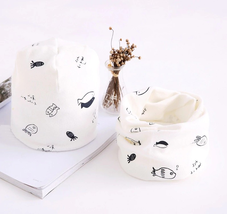 Το χειμερινό καπέλο και το φουλάρι με εκτύπωση ψαράκια θα κρατήσουν το παιδί σας ζεστό.