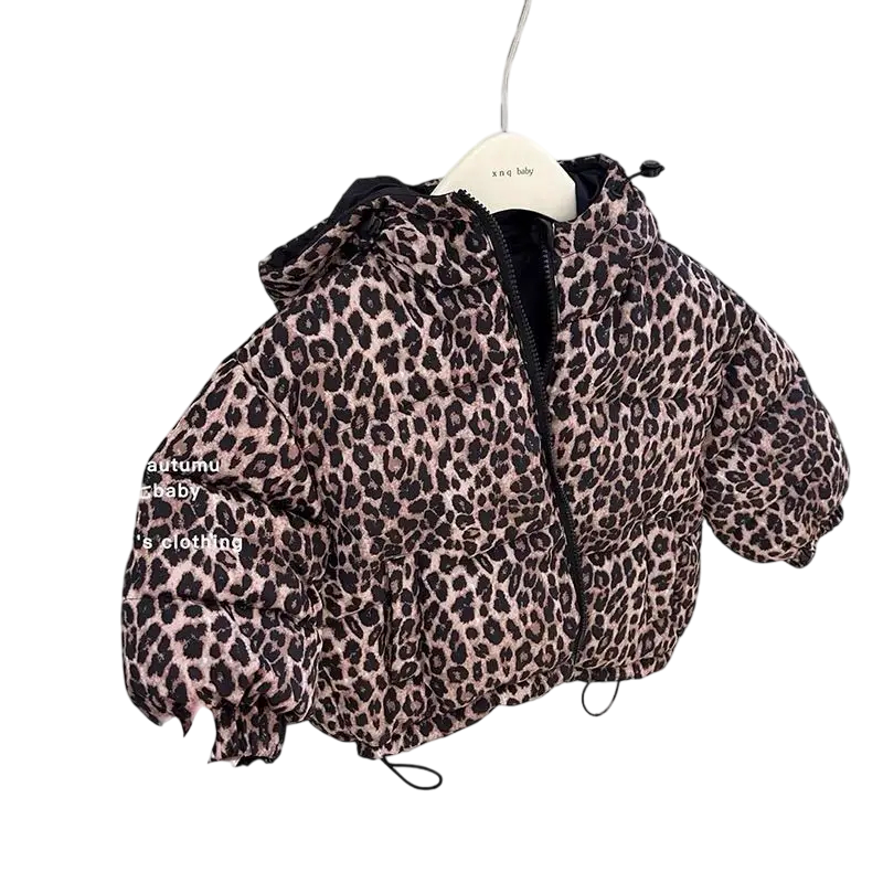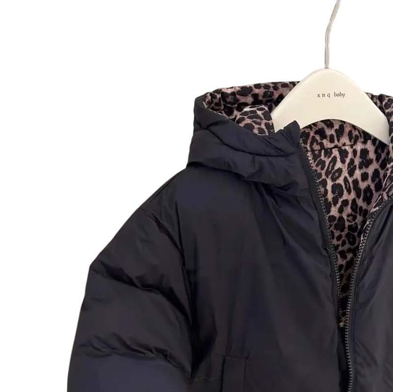 Παιδικό διπλής όψης χειμερινό μπουφάν Unisex με φερμουάρ και κουκούλα Κάτω Leopard σχέδιο και μαύρο χρώμα Πολυεστέρας και βαμβάκι