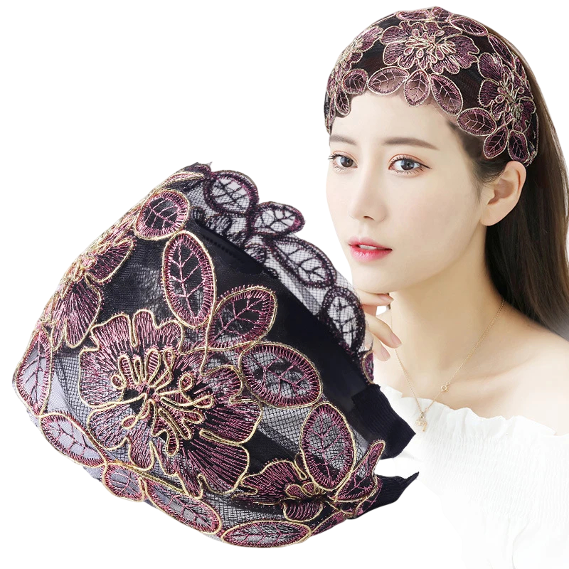 Φαρδιά δαντελένια κορδέλα με λουλουδάτη κεντητική Ενιαίο μέγεθος Κομψή γυναικεία κορδέλα μαλλιών Γιορτινό μόδικο αξεσουάρ μαλλιών