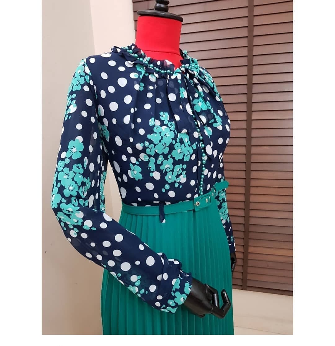Κομψό γυναικείο φόρεμα. Ο κορμός έχει λουλουδάτο τύπωμα και μακριά μανίκια.