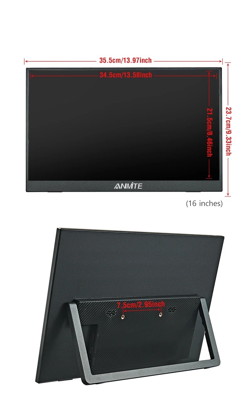 Φορητή οθόνη Anmite 16" είναι αυτόνομη εξωτερική οθόνη κατάλληλη για φορητούς υπολογιστές, επιτραπέζιους υπολογιστές, κονσόλες παιχνιδιών, τηλέφωνα και ταμπλέτες. Δεν είναι ταμπλέτα, αλλά ανεξάρτητη οθόνη προορισμένη για επέκταση ή αναπαραγωγή εικόνας. Χάρη στο χαμηλό βάρος και τις συμπαγείς διαστάσεις της, είναι ιδανική για ταξίδια και εργασία από το σπίτι.