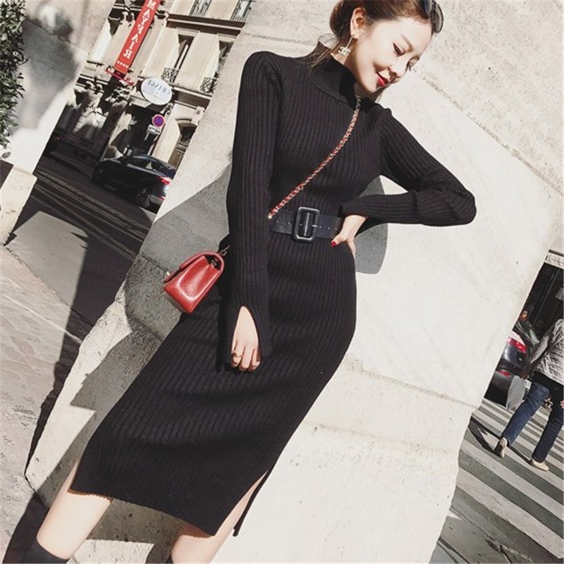 Γυναικεία πιο ζεστά φορέματα από πλέξη με μακριά μανίκια και ψηλό λαιμό.
