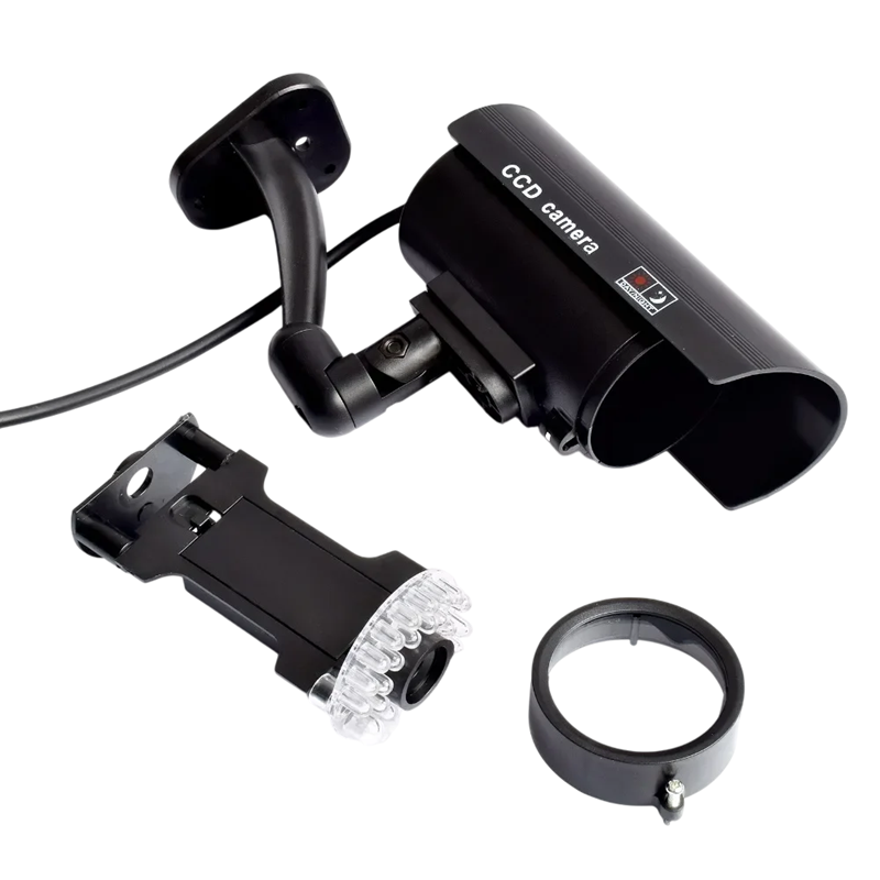 Προσομοίωση κάμερας ασφαλείας με LED για αποτροπή κλεφτών. Ρεαλιστική εμφάνιση, κατάλληλη για σπίτια, καταστήματα και αποθήκες. Χωρίς καλώδια. Πλήρης περιγραφή