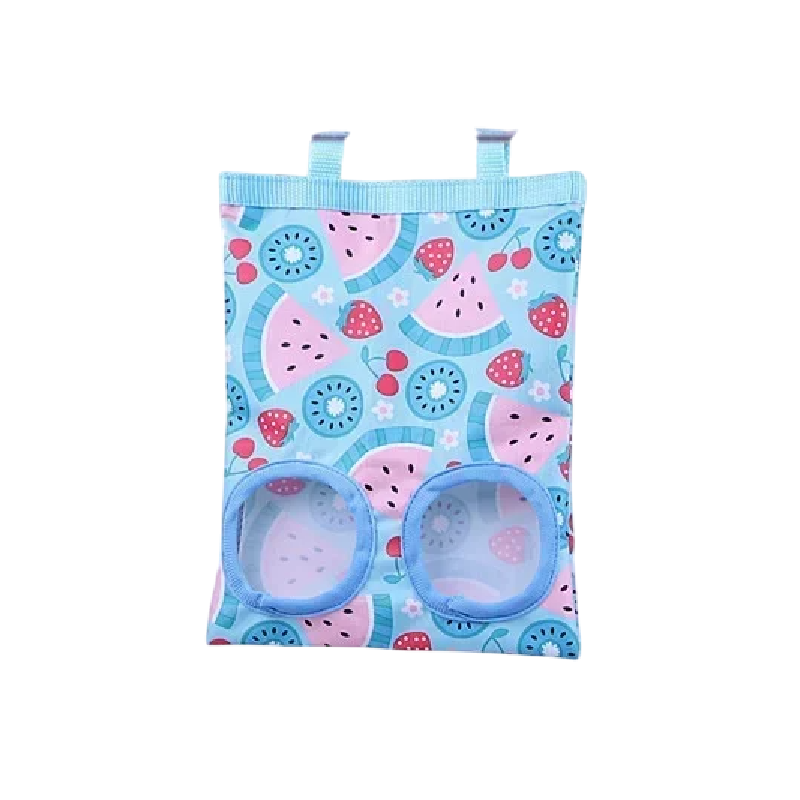 Πρακτική μπλε σακούλα για χόρτο με φρουτώδες σχέδιο, δύο ανοίγματα και θηλιές για κρέμασμα. Ιδανική για τρωκτικά όπως κουνέλια, γουρουνάκια ή τσιντσιλά. Πλήρης περιγραφή
