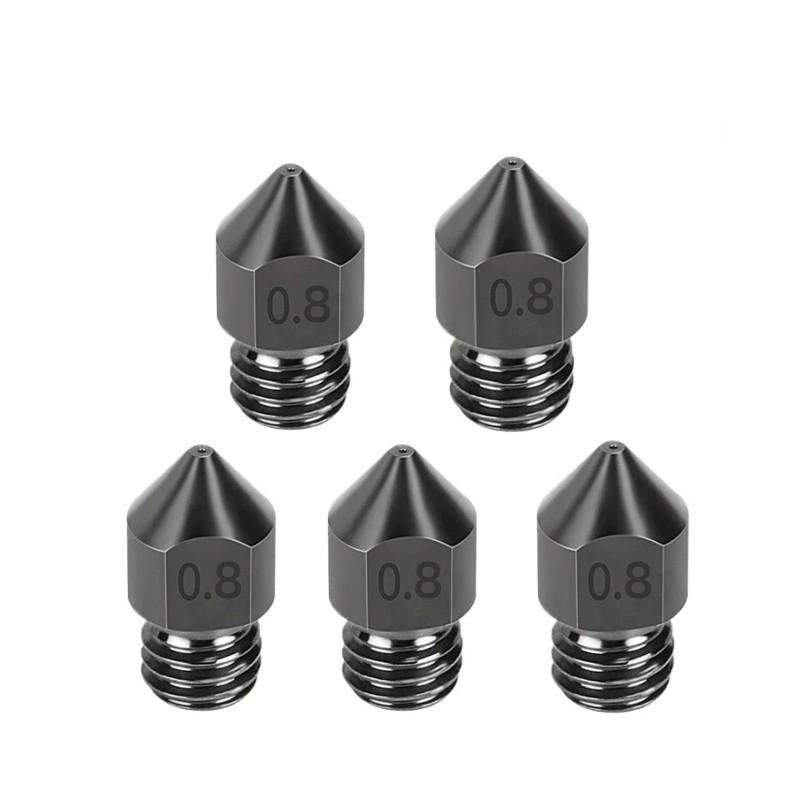 Αυτή η σειρά ακροφυσίων 0,8 mm είναι κατάλληλη για χρήστες που χρειάζονται να παράγουν μεγάλα και ανθεκτικά κομμάτια σε σύντομο χρόνο. Επιτρέπει ταχύτερη εκτύπωση χωρίς σημαντική μείωση ποιότητας, εάν ο εκτυπωτής είναι σωστά ρυθμισμένος. Χάρη στο χρησιμοποιούμενο υλικό, τα ακροφύσια διατηρούν σταθερές ιδιότητες για πολλούς κύκλους εκτύπωσης. Ο εξοικονομημένος χρόνος μπορεί να χρησιμοποιηθεί για άλλες σχεδιάσεις και έργα, καθώς μέρος της εργασίας αφήνεται στην γρήγορη ογκομετρική εκτύπωση. Η σειρά σκληρυμένων χάλκινων ακροφυσίων 0,8 mm είναι επομένως το ιδανικό συμπλήρωμα για πολυδιάστατη χρήση του 3D εκτυπωτή.