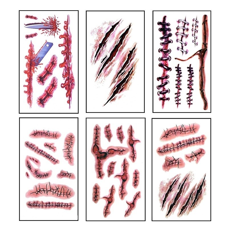 6 κομμάτια διαφόρων ψεύτικων τατουάζ. Σχέδιο ουλών. Μακράς διάρκειας. Εύκολα πλενόμενα. Απλή χρήση. Διαστάσεις: 10,5 x 6 εκ. Πλήρης περιγραφή