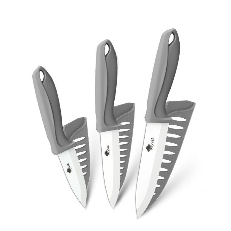 Σέτ κουζινικών μαχαιριών που ταιριάζει σε κάθε κουζίνα. Τα μαχαίρια έχουν εξαιρετική κοφτερότητα. Είναι κατασκευασμένα από κεραμικό υλικό. Είναι ανθεκτικά στη διάβρωση. Ιδανικά για λαχανικά, φρούτα, ψάρια και κρέας.