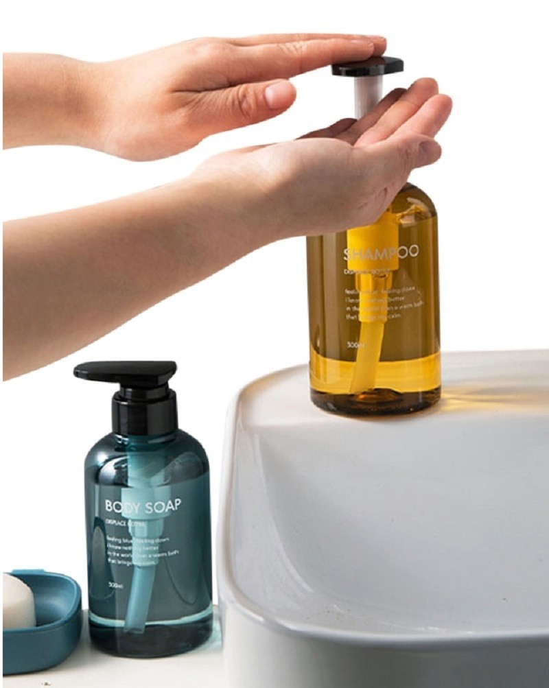 Τα μπουκάλια έχουν σήμανση για σαμπουάν, μαλακτικό και αφρόλουτρο.