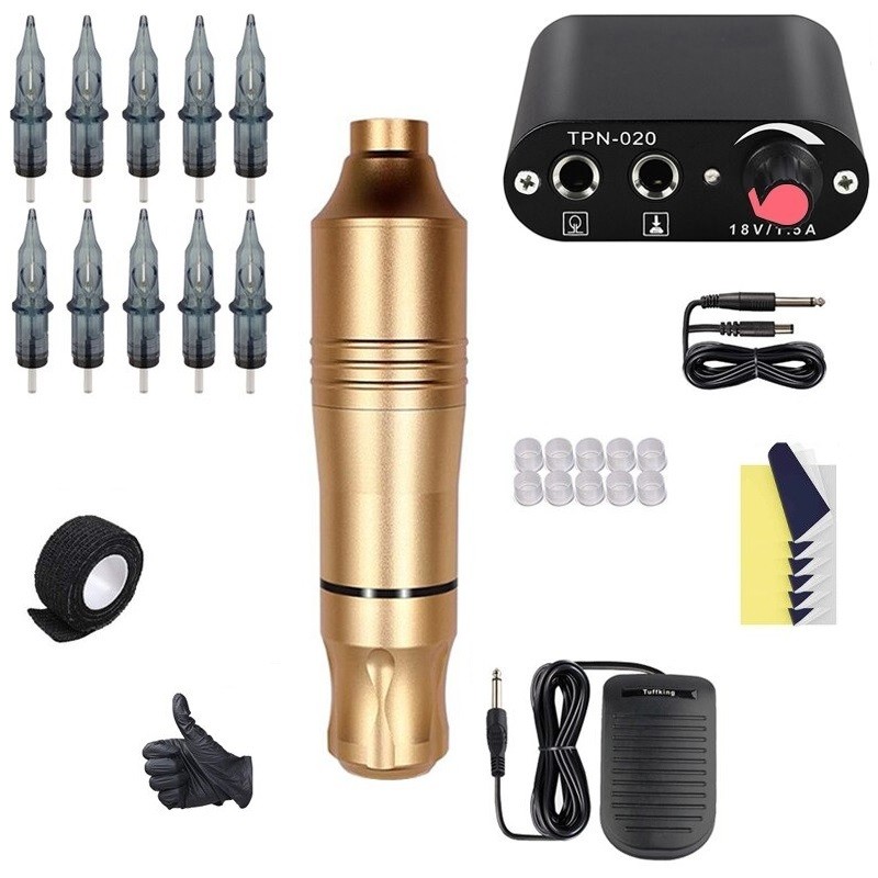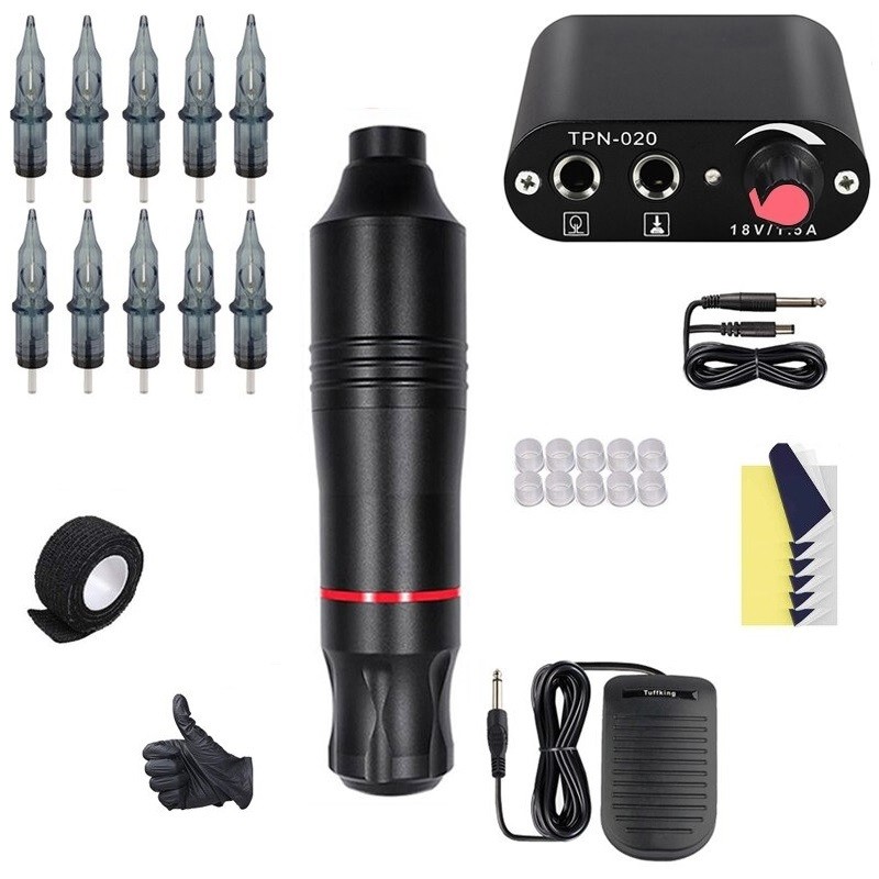 Περιεχόμενα συσκευασίας: 1x περιστροφικό τατουάζ μηχάνημα , 1x τροφοδοτικό με καλώδιο, 10x κασέτες τατουάζ, 1x πεντάλ, 2x γάντια από καουτσούκ, 10x δοχείο για χρώμα, 5x χαρτί για τη μεταφορά σχεδίου