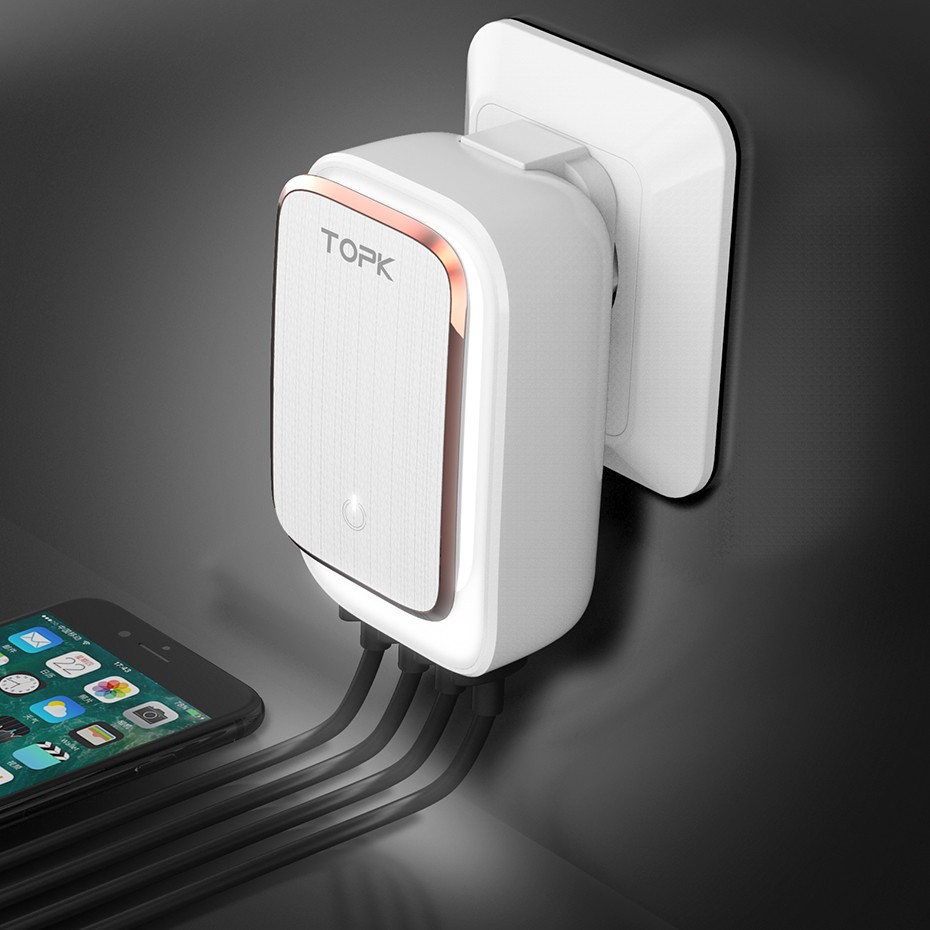 Τοίχου LED φορτιστής με τέσσερις θύρες για φόρτιση περισσότερων συσκευών, ο φορτιστής είναι κατάλληλος για φόρτιση κινητών και ταμπλετών όλων των επωνυμιών.